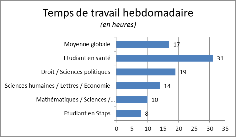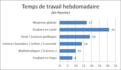 ...hebdomadaire d'un étudiant (révisions, devoirs, lecture...) est de 17h. Ce sont les étudiants en santé qui travaillent le plus, et ceux en Staps qui travaillent le moins. On peut se demander si les écoles d'ingénieurs (dont l'emploi du temps est déjà de 30/35h de cours/semaine), ont été prises en compte. Plus d'un étudiant sur 5 exercent une activité professionnelle rémunérée.
