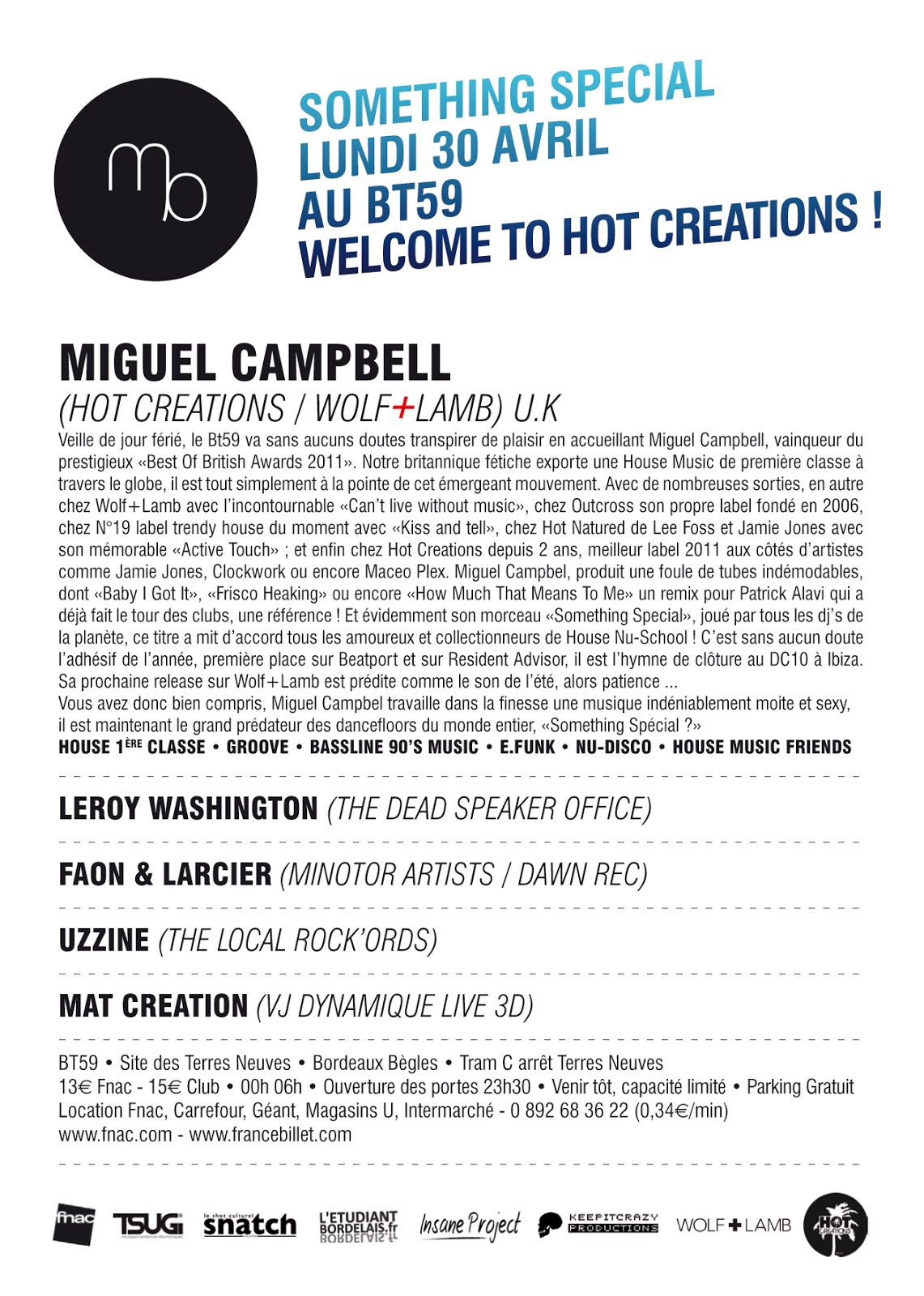 Naviguant entre Miami, NYC, Berlin, Ibiza, La Croatie et Londres, Miguel Campbell jouera sur 4 platines, et sans encodage pendant 1h45. Les locaux choisis sont Leroy Washington, Faon & Larcier et Uzzine ! Le tout accompagné d'un live 3D Dynamique et Soutenu.